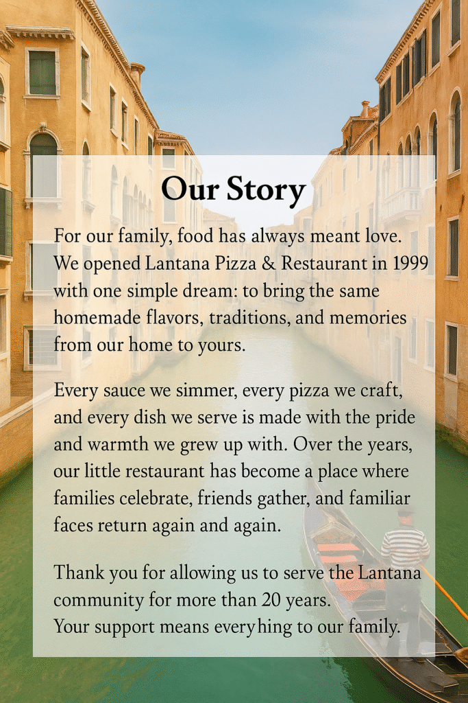 We are overwhelmed by the warm reception we have received from the Lantana Florida Community. Through the years, we have built a reputation for serving mouth-watering pizza complemented with exceptional customer service. We are enthusiastic about our continued service to the community and commitment to creating a memorable dining experience for you.